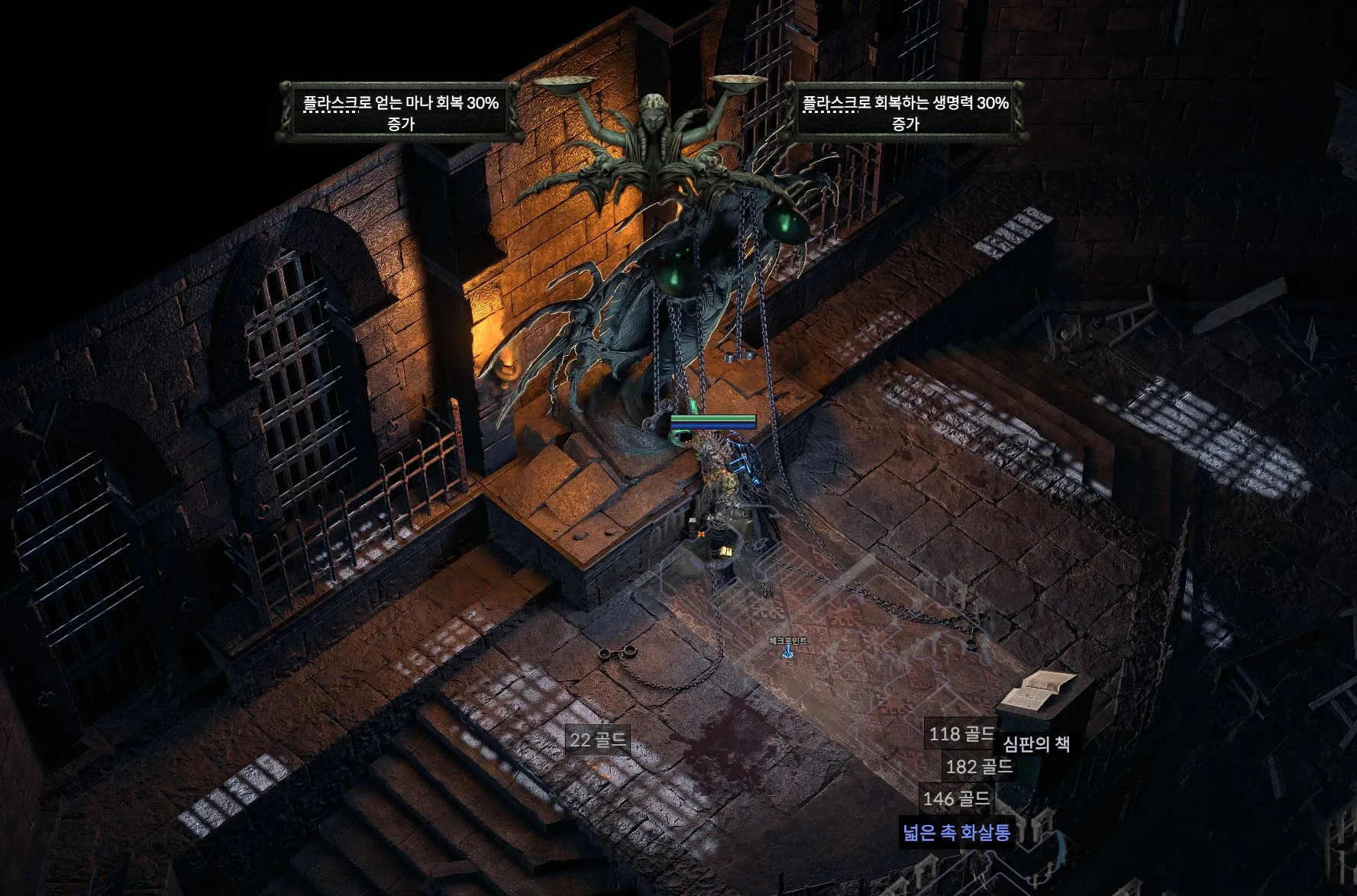 디아모라가 빛을 비추면, 빛을 맞은 뒤쪽의 석상이 가동되어 플레이어에게 석화를 겁니다. 사파이어 호신부를 장착하세요